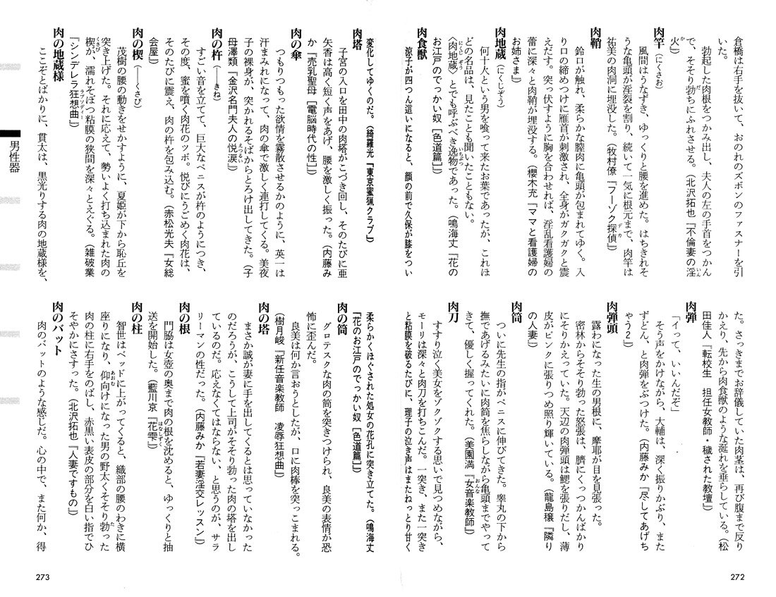 たっくんマニア 光る風を買った本屋で見つけた官能小説用語表現辞典 これはすごい 数多ある官能小説から独特な表現や用語を抜き出した辞典だそうで 目次見るだけで目の前がクラクラする 奥付には十五刷と書かれている ベストセラーじゃないか Http